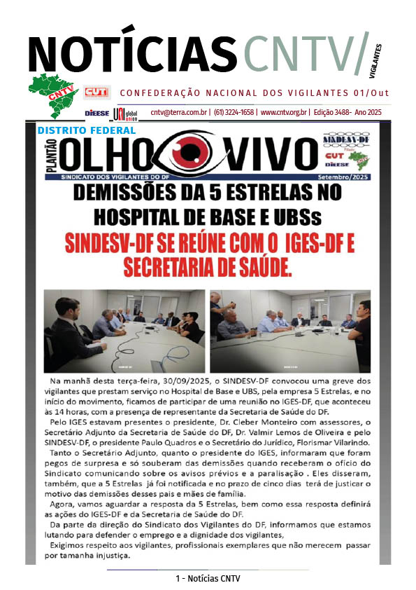 Sindesv-DF se reúne com IGES-DF e Secretaria de Saúde sobre as 45 demissões de vigilantes da empresa 5 Estrelas